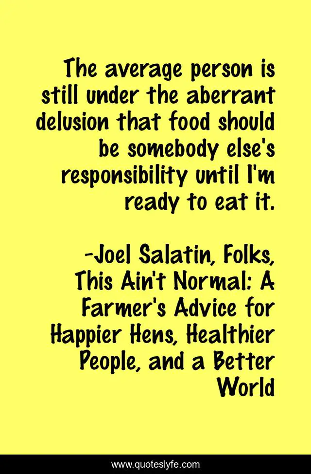 This page presents the quote "The average person is still under the aberrant delusion that food should be somebody else's responsibility until I'm ready to eat it.". Author of this quote is Joel Salatin, Folks, This Ain't Normal: A Farmer's Advice for Happier Hens, Healthier People, and a Better World. This quote is about food, food-security, responsibility,.