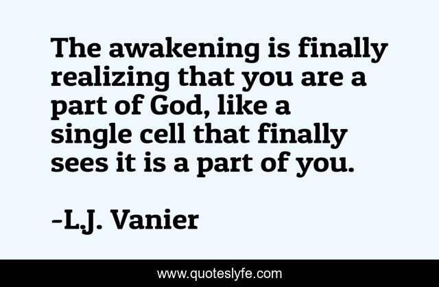 This page presents the quote "The awakening is finally realizing that you are a part of God, like a single cell that finally sees it is a part of you.". Author of this quote is L.J. Vanier. This quote is about awakenings, god, we-are-one, awakening, spiritual-awakening, universe,.