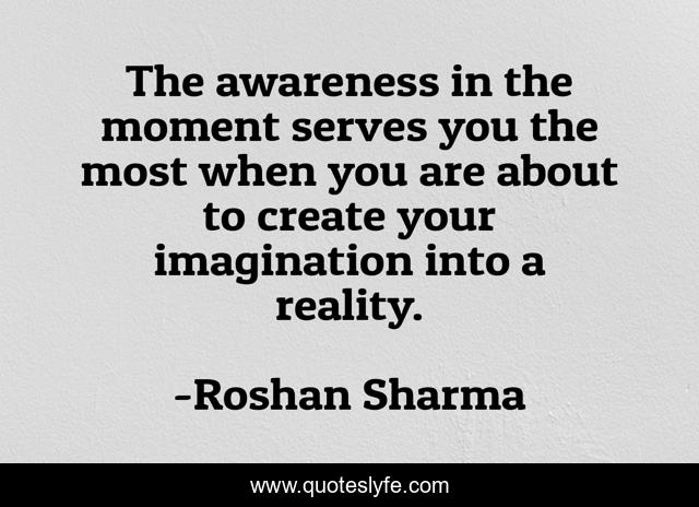 This page presents the quote "The awareness in the moment serves you the most when you are about to create your imagination into a reality.". Author of this quote is Roshan Sharma. This quote is about imagination, create, moment, awareness, reality,.
