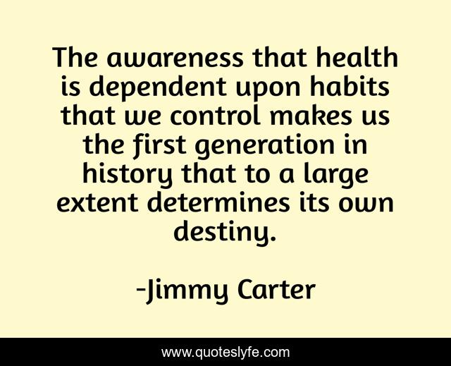 This page presents the quote "The awareness that health is dependent upon habits that we control makes us the first generation in history that to a large extent determines its own destiny.". Author of this quote is Jimmy Carter. This quote is about control, health, destiny,.