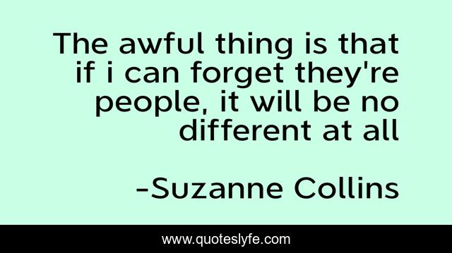 This page presents the quote "The awful thing is that if i can forget they're people, it will be no different at all". Author of this quote is Suzanne Collins. This quote is about life, death, philosophical, philosophy,.