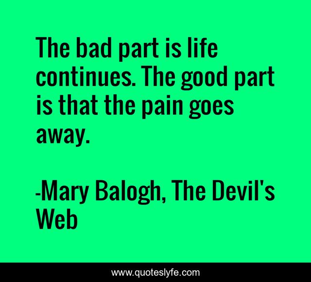 This page presents the quote "The bad part is life continues. The good part is that the pain goes away.". Author of this quote is Mary Balogh, The Devil's Web. This quote is about life, continue, pain,.