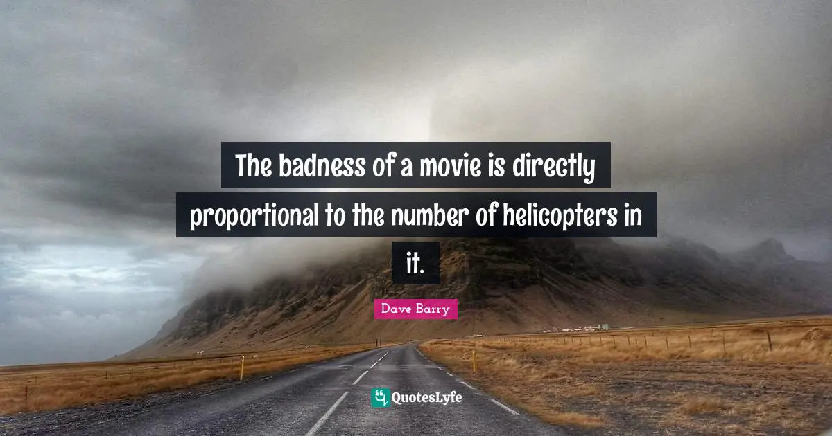 This page presents the quote "The badness of a movie is directly proportional to the number of helicopters in it.". Author of this quote is Dave Barry. This quote is about helicopters, badness, numbers, movie,.