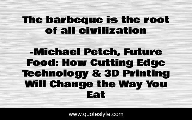 This page presents the quote "The barbeque is the root of all civilization". Author of this quote is Michael Petch, Future Food: How Cutting Edge Technology & 3D Printing Will Change the Way You Eat. This quote is about food, science,.