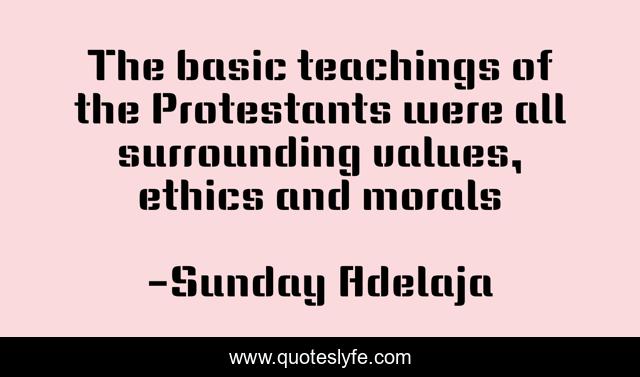 This page presents the quote "The basic teachings of the Protestants were all surrounding values, ethics and morals". Author of this quote is Sunday Adelaja. This quote is about protestants, all, morals, teachings, surrounding, values, basic, ethics,.