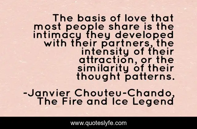 This page presents the quote "The basis of love that most people share is the intimacy they developed with their partners, the intensity of their attraction, or the similarity of their thought patterns.". Author of this quote is Janvier Chouteu-Chando, The Fire and Ice Legend. This quote is about confidence, philosophy, success, positive, motivational, wisdom, romance, spirituality, optimistic,.