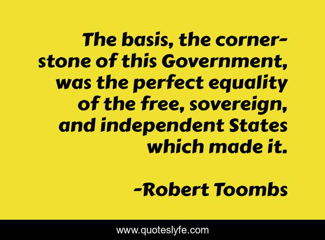 This page presents the quote "The basis, the corner-stone of this Government, was the perfect equality of the free, sovereign, and independent States which made it.". Author of this quote is Robert Toombs. This quote is about perfect, free, government,.