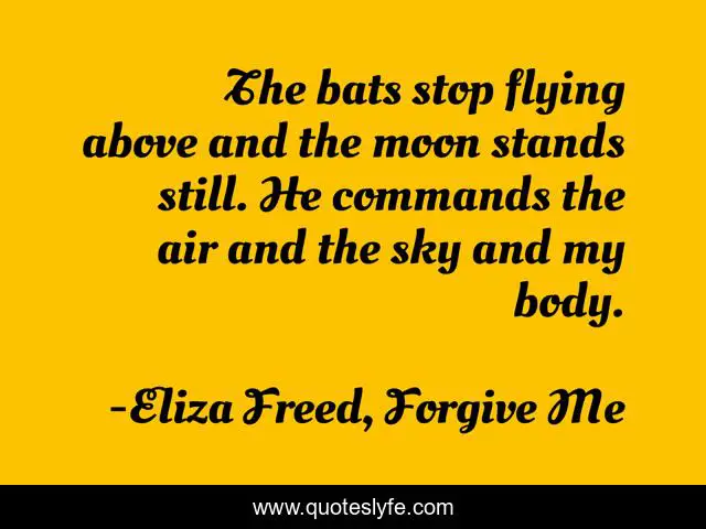 This page presents the quote "The bats stop flying above and the moon stands still. He commands the air and the sky and my body.". Author of this quote is Eliza Freed, Forgive Me. This quote is about new-adult-romance, contemporary-romance, western-romance,.