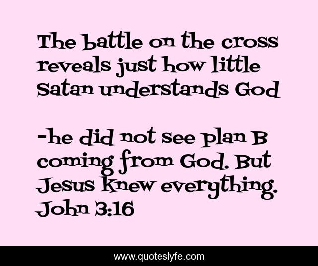 This page presents the quote "The battle on the cross reveals just how little Satan understands God". Author of this quote is he did not see plan B coming from God. But Jesus knew everything. John 3:16. This quote is about face to face meetings with jesus christ 2: astounding biblical mysteries revealed in his own words like never before in human history, felix wantang,.