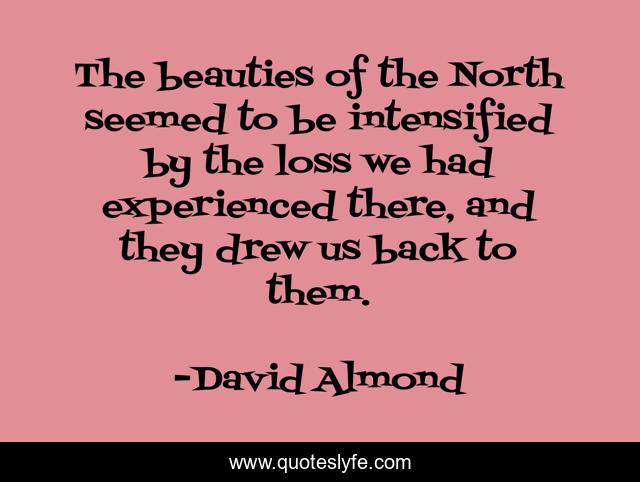 This page presents the quote "The beauties of the North seemed to be intensified by the loss we had experienced there, and they drew us back to them.". Author of this quote is David Almond. This quote is about loss, romanticism,.