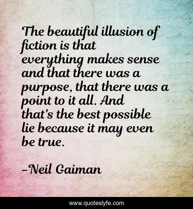 This page presents the quote "The beautiful illusion of fiction is that everything makes sense and that there was a purpose, that there was a point to it all. And that's the best possible lie because it may even be true.". Author of this quote is Neil Gaiman. .