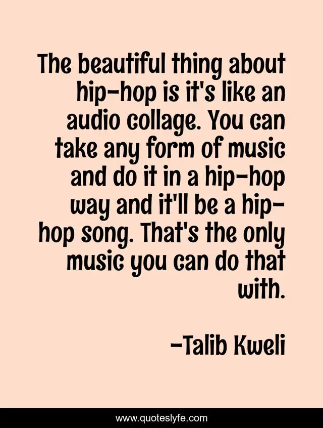 This page presents the quote "The beautiful thing about hip-hop is it's like an audio collage. You can take any form of music and do it in a hip-hop way and it'll be a hip-hop song. That's the only music you can do that with.". Author of this quote is Talib Kweli. This quote is about beautiful, song,.