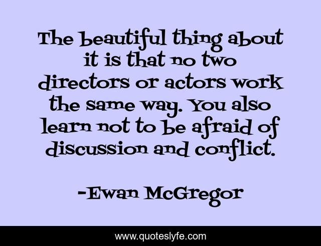 This page presents the quote "The beautiful thing about it is that no two directors or actors work the same way. You also learn not to be afraid of discussion and conflict.". Author of this quote is Ewan McGregor. This quote is about movies, acting, actors, directors,.