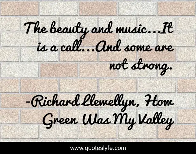 This page presents the quote "The beauty and music...It is a call...And some are not strong.". Author of this quote is Richard Llewellyn, How Green Was My Valley. This quote is about chastity, power, virtue,.
