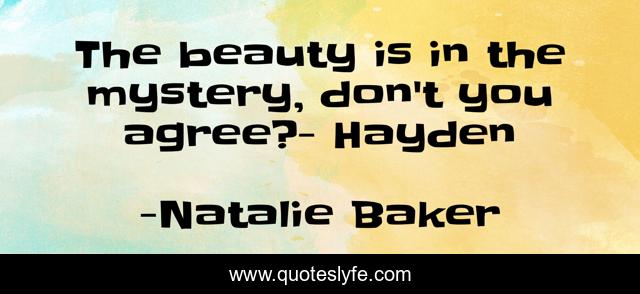 This page presents the quote "The beauty is in the mystery, don't you agree?- Hayden". Author of this quote is Natalie Baker. This quote is about mystery, beauty,.