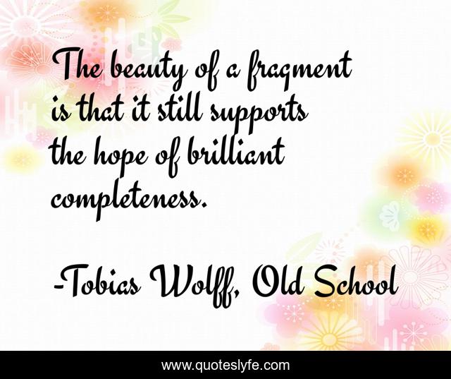 This page presents the quote "The beauty of a fragment is that it still supports the hope of brilliant completeness.". Author of this quote is Tobias Wolff, Old School. This quote is about longing, hope,.