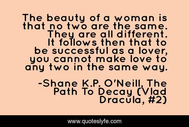 This page presents the quote "The beauty of a woman is that no two are the same. They are all different. It follows then that to be successful as a lover, you cannot make love to any two in the same way.". Author of this quote is Shane K.P. O'Neill, The Path To Decay (Vlad Dracula, #2). This quote is about romance, dracula, horror, gothic, historical,.