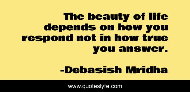 This page presents the quote "The beauty of life depends on how you respond not in how true you answer.". Author of this quote is Debasish Mridha. This quote is about how-true-you-answer, beauty-of-life, philosophy, debasish-mridha, quotes, debasish-mridha-md, inspirational, enthusiasm, how-you-respond,.