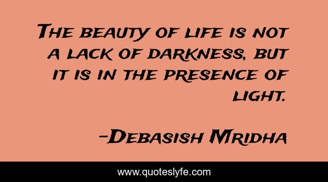 This page presents the quote "The beauty of life is not a lack of darkness, but it is in the presence of light.". Author of this quote is Debasish Mridha. This quote is about lack-of-darkness, philosophy, mridha, debasish, debasish-mridha, presence-of-light, beauty-of-life,.