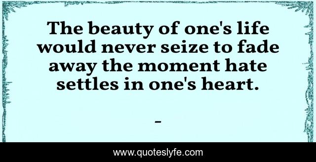 This page presents the quote "The beauty of one's life would never seize to fade away the moment hate settles in one's heart.". Author of this quote is . This quote is about heart, hate-in-one-s-heart, edmond-mbiaka, the-beauty-of-one-s-life, life-is-beautiful, hate,.
