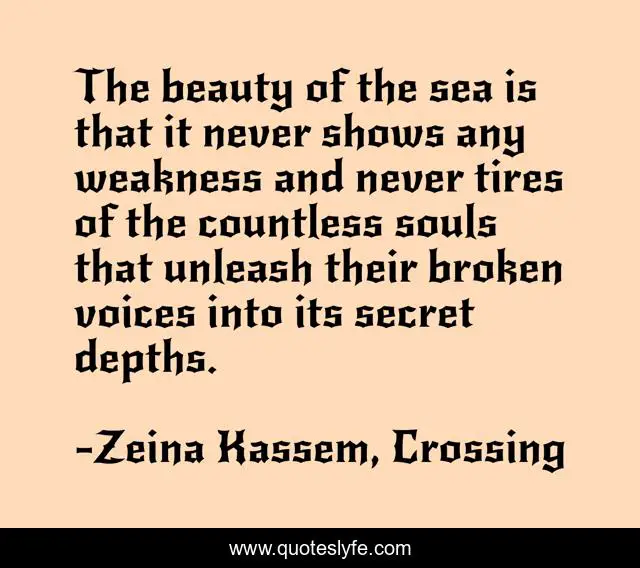 This page presents the quote "The beauty of the sea is that it never shows any weakness and never tires of the countless souls that unleash their broken voices into its secret depths.". Author of this quote is Zeina Kassem, Crossing. This quote is about arab, life, death, pain, middle-eastern, missing, lebanon, missing-someone, grief,.