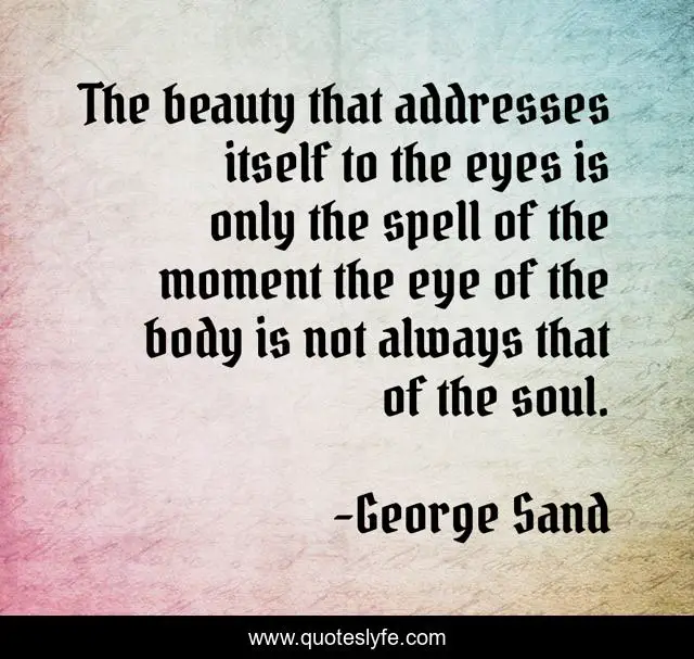 This page presents the quote "The beauty that addresses itself to the eyes is only the spell of the moment the eye of the body is not always that of the soul.". Author of this quote is George Sand. This quote is about eyes, eye, soul,.