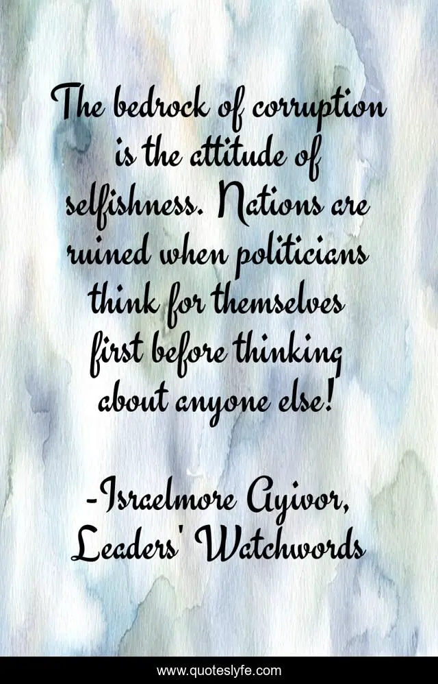 This page presents the quote "The bedrock of corruption is the attitude of selfishness. Nations are ruined when politicians think for themselves first before thinking about anyone else!". Author of this quote is Israelmore Ayivor, Leaders' Watchwords. This quote is about me-alone, selfish, food-for-thought, deception, israelmore-ayivor, self-will, correction, political, attitude,.