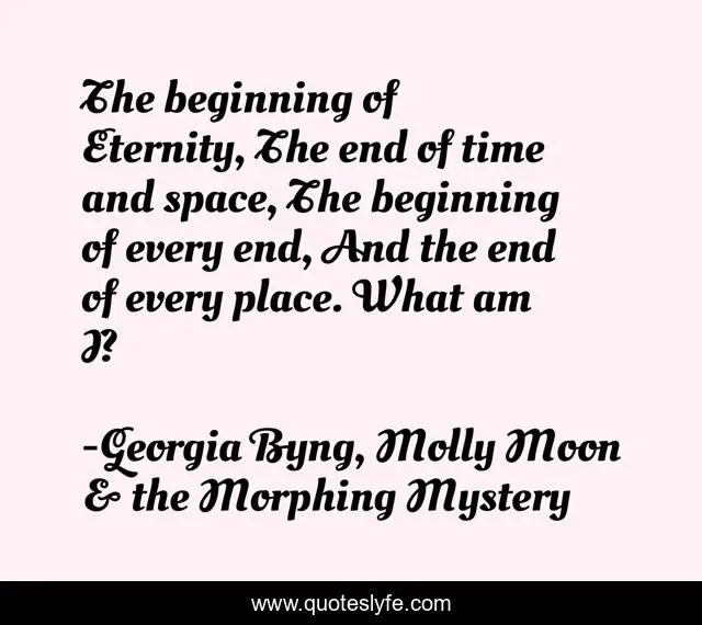 This page presents the quote "The beginning of Eternity, The end of time and space, The beginning of every end, And the end of every place. What am I?". Author of this quote is Georgia Byng, Molly Moon & the Morphing Mystery. This quote is about eternity, riddle, georgia-byng, molly-moon, space,.