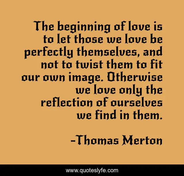 This page presents the quote "The beginning of love is to let those we love be perfectly themselves, and not to twist them to fit our own image. Otherwise we love only the reflection of ourselves we find in them.". Author of this quote is Thomas Merton. This quote is about reflection, relationship,.