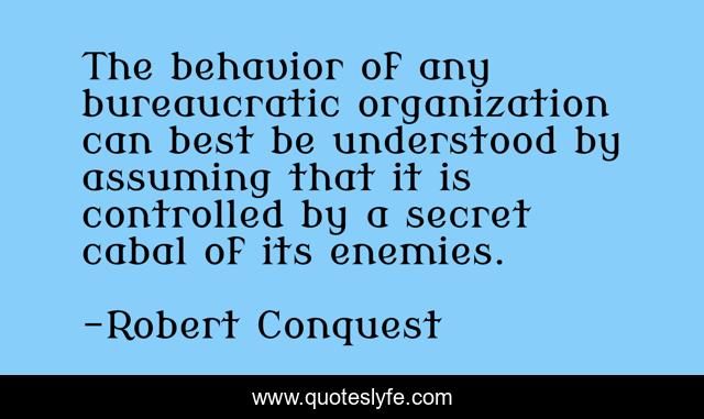 This page presents the quote "The behavior of any bureaucratic organization can best be understood by assuming that it is controlled by a secret cabal of its enemies.". Author of this quote is Robert Conquest. This quote is about bereaucracy, management, comedy, funny,.