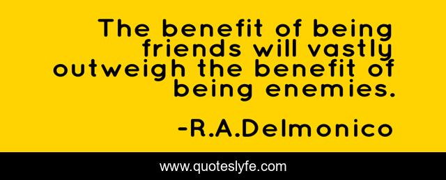 This page presents the quote "The benefit of being friends will vastly outweigh the benefit of being enemies.". Author of this quote is R.A.Delmonico. .