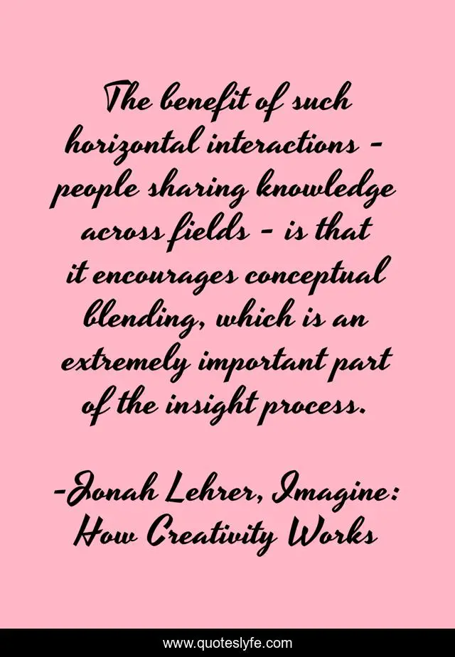 This page presents the quote "The benefit of such horizontal interactions - people sharing knowledge across fields - is that it encourages conceptual blending, which is an extremely important part of the insight process.". Author of this quote is Jonah Lehrer, Imagine: How Creativity Works. This quote is about communication, insight, knowledge,.