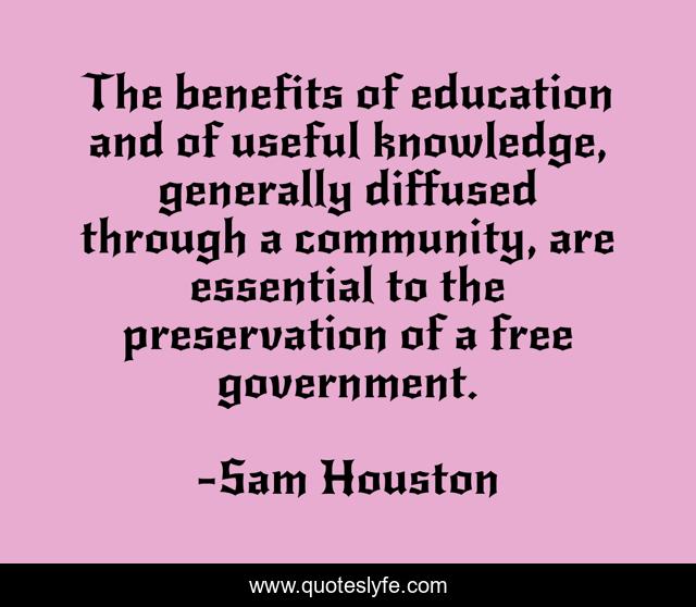 This page presents the quote "The benefits of education and of useful knowledge, generally diffused through a community, are essential to the preservation of a free government.". Author of this quote is Sam Houston. This quote is about education, community,.
