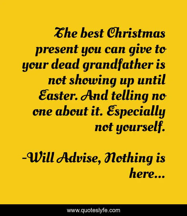 This page presents the quote "The best Christmas present you can give to your dead grandfather is not showing up until Easter. And telling no one about it. Especially not yourself.". Author of this quote is Will Advise, Nothing is here.... This quote is about death, festive, best, easter, festivities, dead, grandfather, informing, inform,.