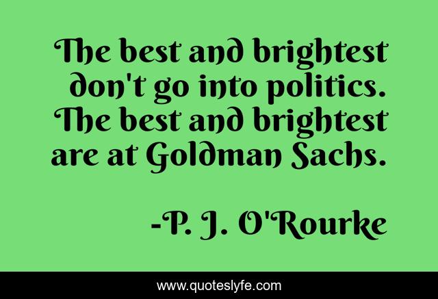 This page presents the quote "The best and brightest don't go into politics. The best and brightest are at Goldman Sachs.". Author of this quote is P. J. O'Rourke. This quote is about go, brightest, best,.