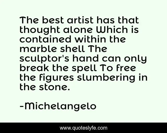 This page presents the quote "The best artist has that thought alone Which is contained within the marble shell The sculptor's hand can only break the spell To free the figures slumbering in the stone.". Author of this quote is Michelangelo. This quote is about alone, thought, artist,.