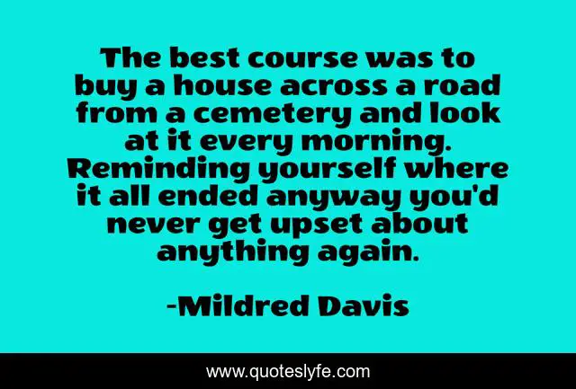 This page presents the quote "The best course was to buy a house across a road from a cemetery and look at it every morning. Reminding yourself where it all ended anyway you'd never get upset about anything again.". Author of this quote is Mildred Davis. This quote is about positive, confidence,.