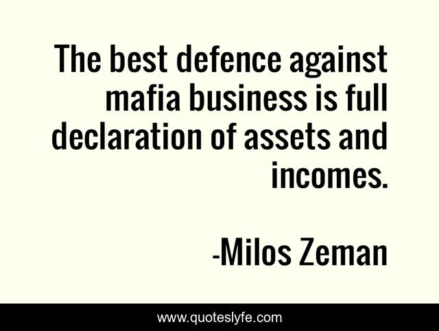 This page presents the quote "The best defence against mafia business is full declaration of assets and incomes.". Author of this quote is Milos Zeman. This quote is about mafia, assets, best,.
