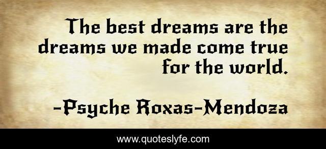 This page presents the quote "The best dreams are the dreams we made come true for the world.". Author of this quote is Psyche Roxas-Mendoza. This quote is about come, true, best, dreams, world,.