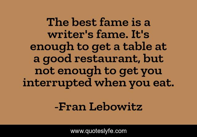 This page presents the quote "The best fame is a writer's fame. It's enough to get a table at a good restaurant, but not enough to get you interrupted when you eat.". Author of this quote is Fran Lebowitz. This quote is about writers, fame, writing,.