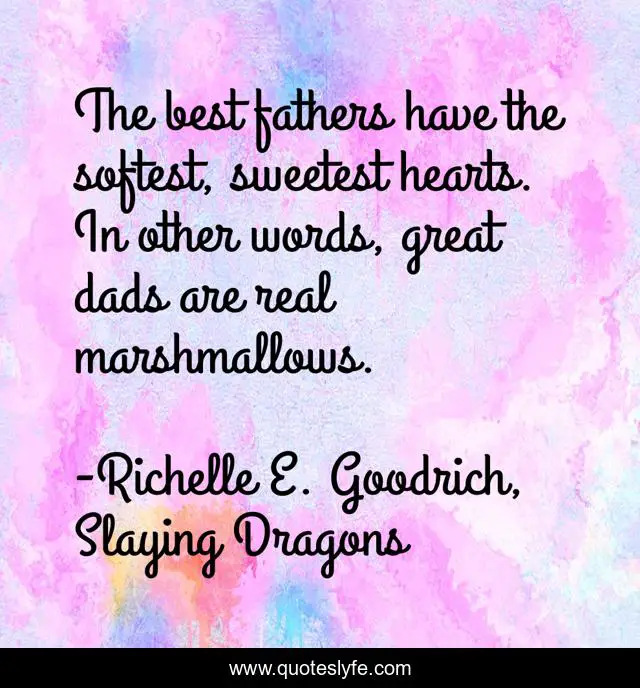 This page presents the quote "The best fathers have the softest, sweetest hearts. In other words, great dads are real marshmallows.". Author of this quote is Richelle E. Goodrich, Slaying Dragons. This quote is about dad-s-day, richelle-e-goodrich, fathers, richelle, dads, father-s-day, great-dads, richelle-goodrich, the-best-fathers,.