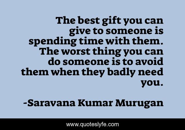 This page presents the quote "The best gift you can give to someone is spending time with them. The worst thing you can do someone is to avoid them when they badly need you.". Author of this quote is Saravana Kumar Murugan. This quote is about life, gift, time,.