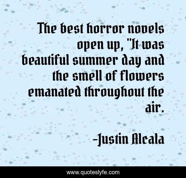 This page presents the quote "The best horror novels open up, "It was beautiful summer day and the smell of flowers emanated throughout the air.". Author of this quote is Justin Alcala. This quote is about scary, horror, books,.
