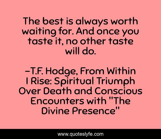 This page presents the quote "The best is always worth waiting for. And once you taste it, no other taste will do.". Author of this quote is T.F. Hodge, From Within I Rise: Spiritual Triumph Over Death and Conscious Encounters with "The Divine Presence". This quote is about anticipation, success, taste, satisfaction, patience, waiting, change, reward, best,.