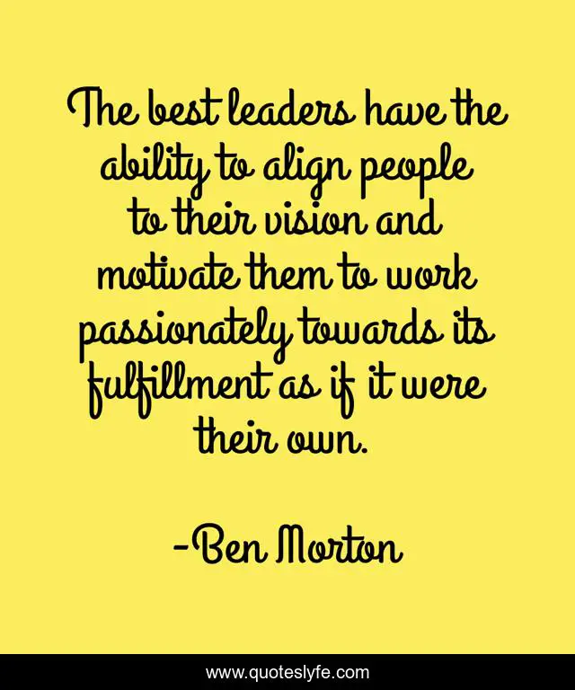This page presents the quote "The best leaders have the ability to align people to their vision and motivate them to work passionately towards its fulfillment as if it were their own.". Author of this quote is Ben Morton. This quote is about enthusiasm, leadership, inspirational,.