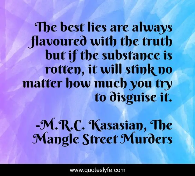 This page presents the quote "The best lies are always flavoured with the truth but if the substance is rotten, it will stink no matter how much you try to disguise it.". Author of this quote is M.R.C. Kasasian, The Mangle Street Murders. .