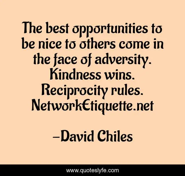 This page presents the quote "The best opportunities to be nice to others come in the face of adversity. Kindness wins. Reciprocity rules. NetworkEtiquette.net". Author of this quote is David Chiles. This quote is about blog, social-media, social-network, internet-etiquette, netiquette-rules, netiquette, network-etiquette, micro-blog,.