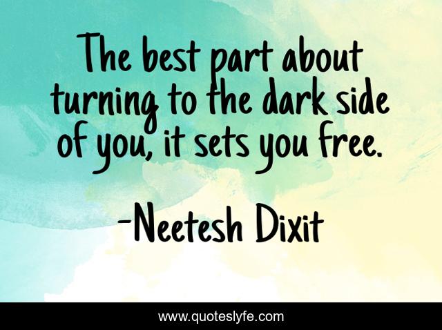 This page presents the quote "The best part about turning to the dark side of you, it sets you free.". Author of this quote is Neetesh Dixit. This quote is about betrayal, life, philosophy, pain,.