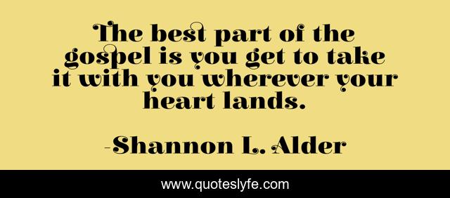 This page presents the quote "The best part of the gospel is you get to take it with you wherever your heart lands.". Author of this quote is Shannon L. Alder. This quote is about stay-positive, white-path, peace, love, endless-love, meek, journeys, compassion, trials,.