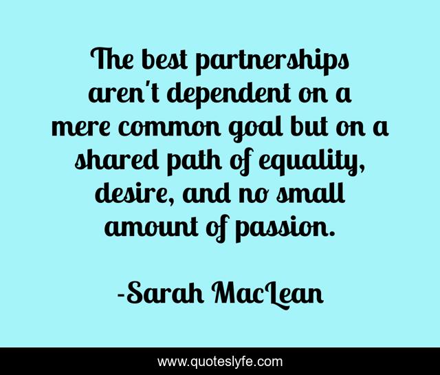 This page presents the quote "The best partnerships aren't dependent on a mere common goal but on a shared path of equality, desire, and no small amount of passion.". Author of this quote is Sarah MacLean. This quote is about path, passion, best,.